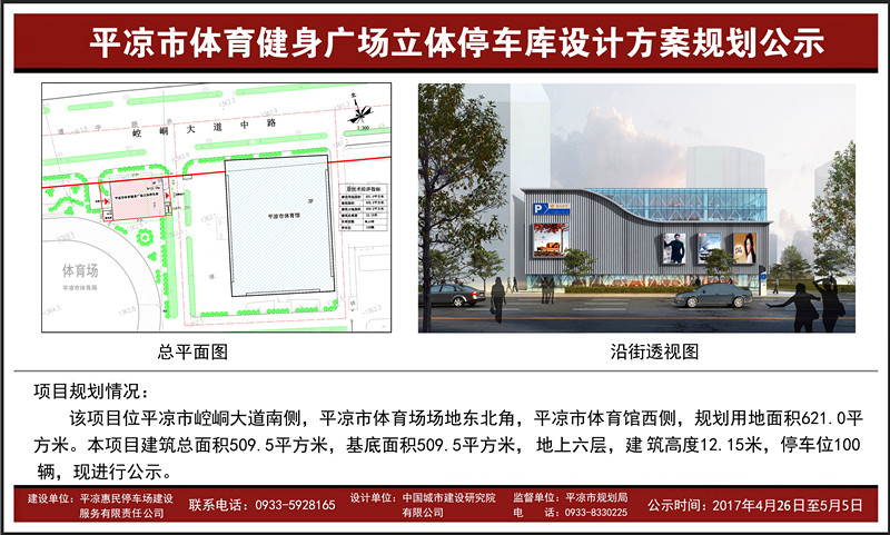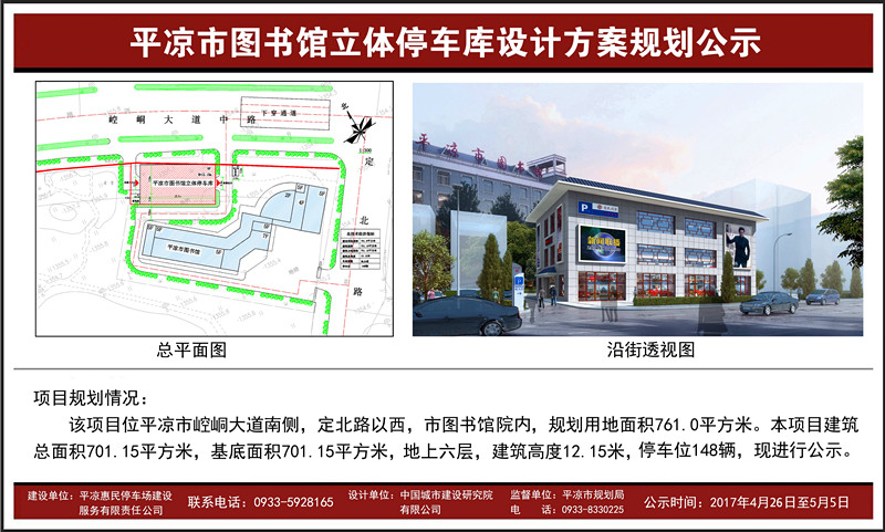 平凉宾馆、体育健身广场、市图书馆3处立体停车库设计方案经市规划局审查及市规委会2017年4月第一次会议审定通过。4月26日下午, 3处立体停车库设计方案在规划局网站上公示。