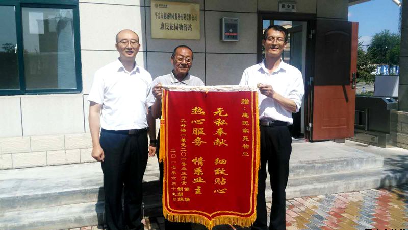 近日,惠民花园物管站工作人员正在门口忙着修剪草坪,一名年轻女士急匆匆地冲了进来,把一面写着“无私奉献、细致贴心、热心服务、情系业主”的锦旗放在了办公桌上,嘴里不停的念叨,“多亏你们了,多亏你们了......”,物业站的工作人员一脸疑惑,经过仔细询问才知道,年轻女士是惠民花园9号楼1单元住户胡青山大爷的女儿。