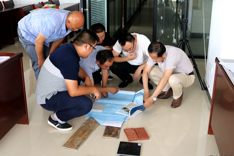 讨论会现场,参会人员按照室外配套工程设计图纸,参照报送的装饰材料样品,确定了室外配套工程所使用的装饰材料类型、规格及使用部位,并结合小区定位及整体风格,分别对健身广场、休闲广场、小区主入口、景墙、中心水景及次入口活动广场等构筑物所使用的装饰材料进行了二次优化。