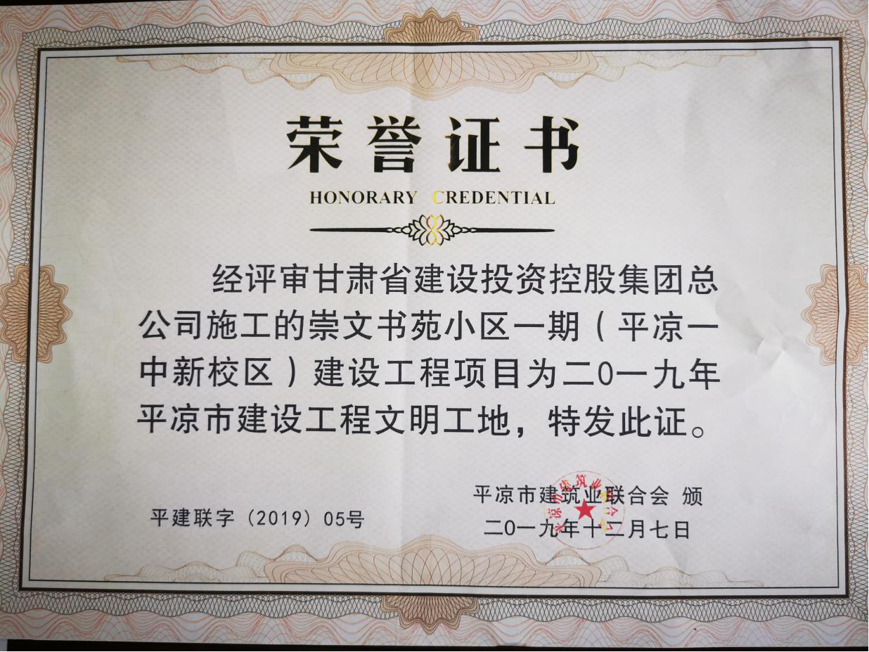 近年来,惠民公司狠抓工程质量安全,坚持贯彻“安全第一、预防为主”的方针,严格执行国家的有关施工安全的规范、规程和施工安全的有关规定,严格执行招标文件有关的施工安全和文明施工的要求,全力打造精品工程、样板工程,认真贯彻落实文明工地创建要求,大力宣贯文明、安全和环保施工理念,强化文明绿色施工。2015年甘肃省第八建设集团有限责任公司、甘肃省静宁县第二建筑工程有限责任公司、甘肃省第六建设集团有限责任公司承建的新城国际1#、10#和7#楼均获得“平凉市文明工地”称号,2016年由金江建筑安装工程有限公司承建的新北嘉园棚户区改造4号楼获得市级“文明工地”称号,2016至2018年由平凉市建筑工程有限责任公司、第四建设集团有限责任公司承建的新北嘉园5#、2#、9#楼及地下车库标段获得“省级文明工地“称号。2018由甘肃第五建设集团承建的惠民投资大厦获得“省级文明工地”称号。由甘建投承建的平凉一中新校区建设项目获得2019“市级文明工地”称号,同年还获得“绿色文明工地”称号。御景华府已向住建局申报市级文明工地,待主体竣工后进行评选。