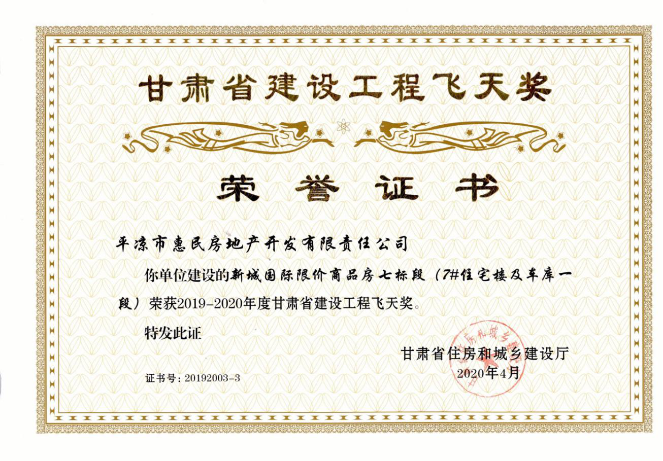 我公司2014年开发建设的新城国际小区7号楼,斩获2019-2020年度甘肃省建设工程“飞天奖”。据悉,该奖项是甘肃省建设工程质量最高荣誉奖,在市优质工程的基础上,每年评选表彰一次。荣获该奖项,是对惠民公司房产开发项目质量的又一次肯定。