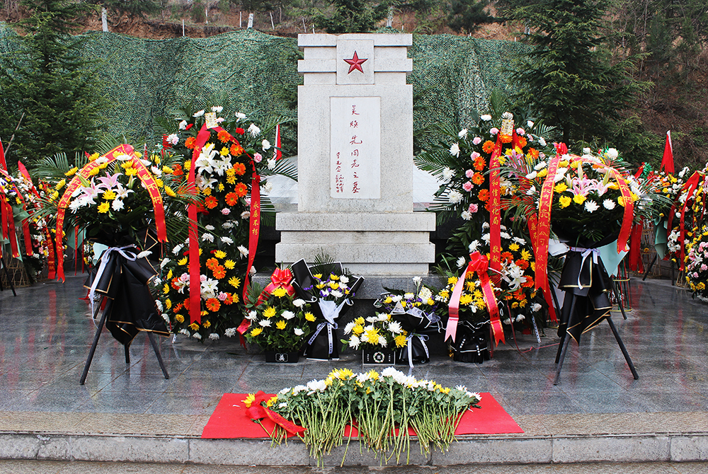 向吴焕先革命烈士敬献花篮并整理缎带