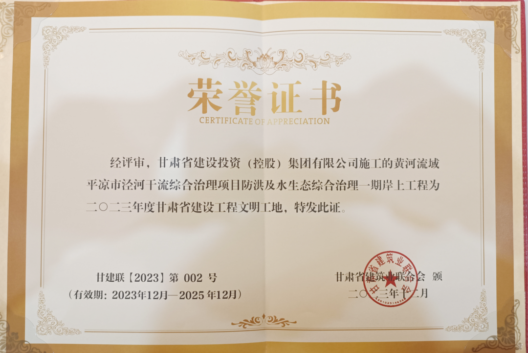 近日,由平凉球王会网页版集团实施的黄河流域平凉市泾河干流综合治理项目防洪及水生态综合治理一期岸上工程,荣获 2023 年度甘肃省建设工程文明工地荣誉称号。这是该项目获得中国海绵城市十年成就展项目典范之后,荣获的又一殊荣。