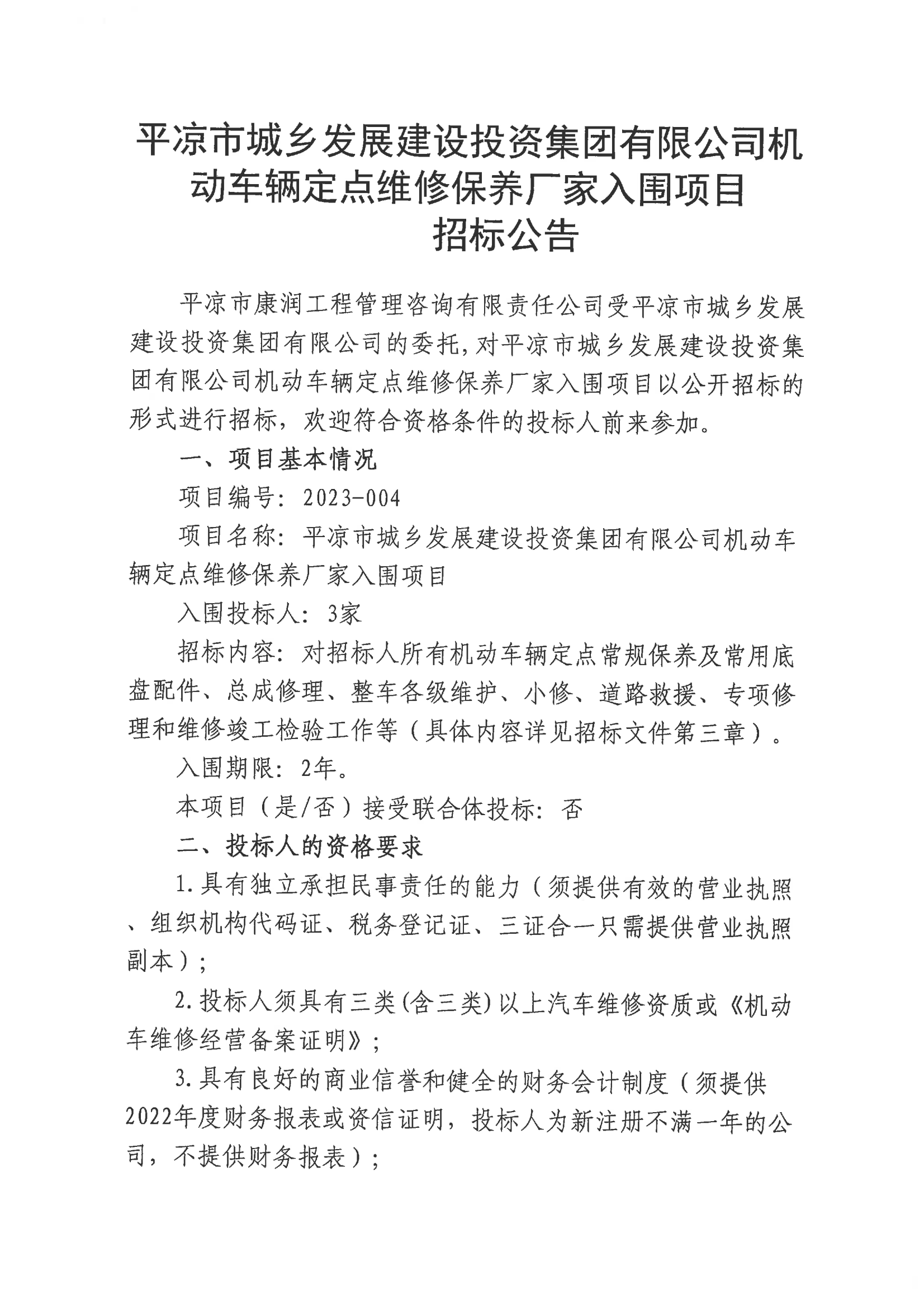 机动车辆定点维修保养厂家入围项目招标公告